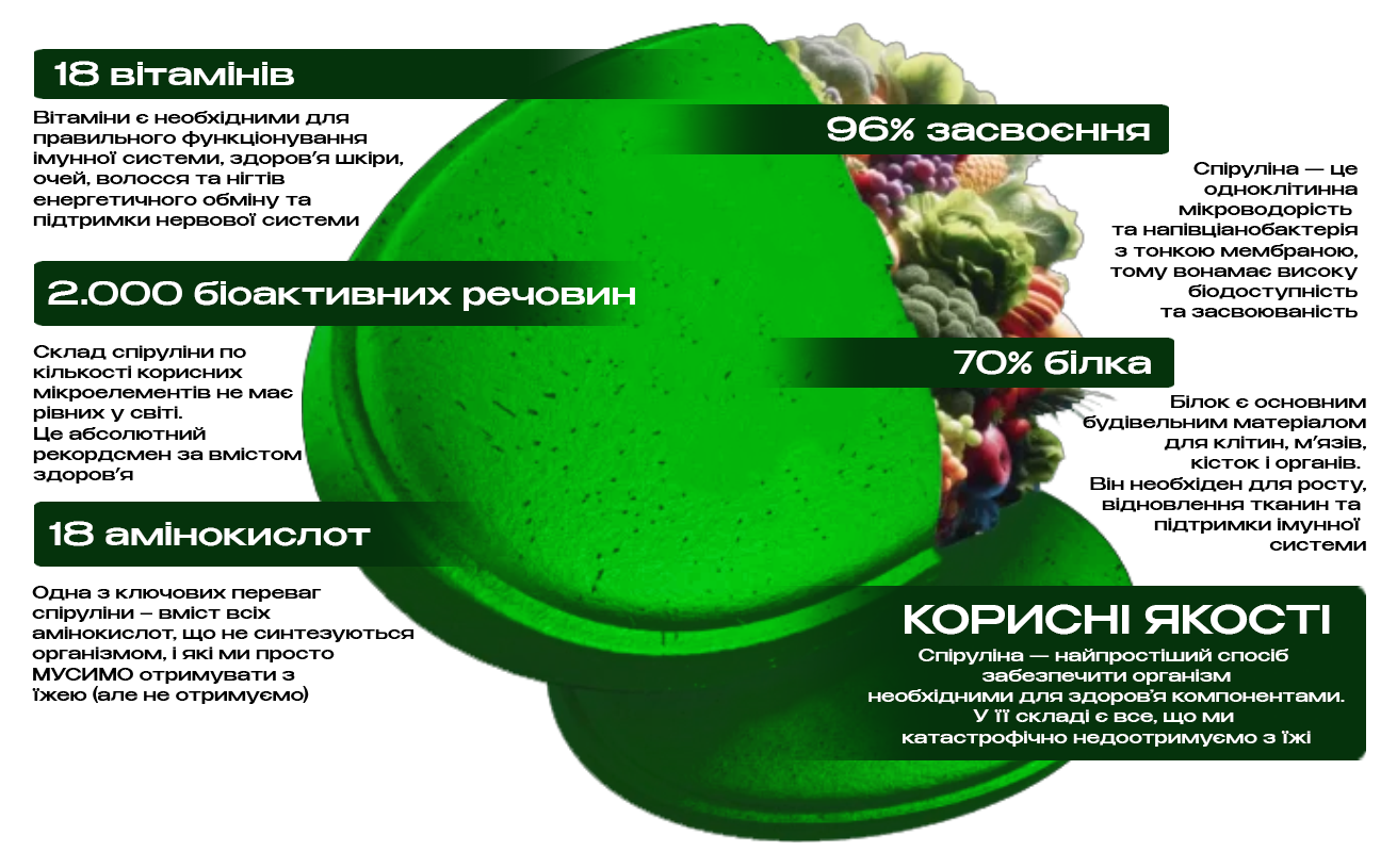 ДВА. Стільки існує на планеті озер, де спіруліна та хлорела ростуть самостійно, а не вирощуються штучно. Саме завдяки природному походженню вони мають незрівнянний склад.